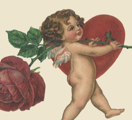 (photo: on a neutral, yellowish background walks a cherub cheerfully trotting along with their left leg kicked ahead of them, anticipating their next step. the cherub is seen holding a rose larger than the winged child over their left shoulder. the petals a deep, blood red. the stem and leaves evergreen. a heart the color of the rose petals sits behind the cherub from the bottom of their torso to their rosy cheeks. their wings tinted blue and pink like the heavenly skies.)